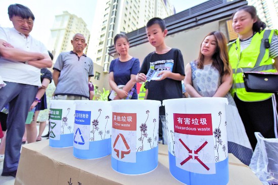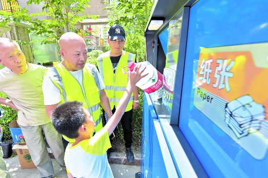 圖①:7月7日,社區(qū)垃圾分類志愿者協(xié)助小朋友進行垃圾分類投放。