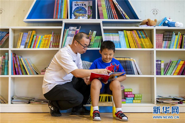 7月9日,在河北省衡水市武邑縣新華書店,小朋友在家長陪伴下讀書。新華社記者 李曉果 攝