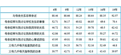 高學(xué)歷父母檢查作業(yè)的頻次不高。如果以父母教育水平作為社會階層的劃分依據(jù),數(shù)據(jù)顯示,社會階層越高的父母陪伴子女高頻率參加文化活動的比重越大。例如,父母雙方受教育程度最大為“大學(xué)及以上”的學(xué)生中有16.69%的人表示“上個月與父母外出看電影、演出、體育比賽的頻率為每周兩次以上”,相比之下父母雙方受教育程度最大為“小學(xué)”的學(xué)生中只有8.65%的人報告此選項。而且社會階層越高的父母和子女的關(guān)系越親近。例如,母親受教育年限為19年的學(xué)生中有92.57%的人選擇了“我和媽媽的關(guān)系非常親近”;70.40%的人表示“母親經(jīng)常與我討論學(xué)校發(fā)生的事情”;62.42%的人認(rèn)為“母親經(jīng)常與我討論我的心事或煩惱”。