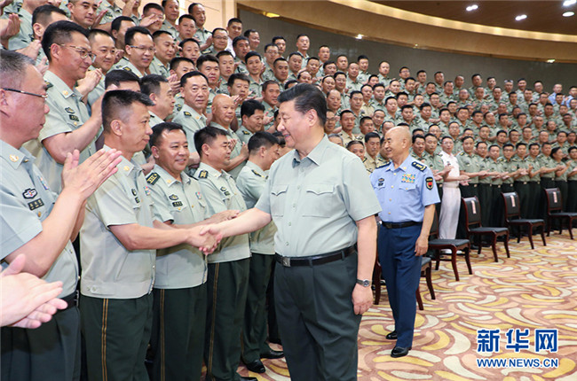 7月15日至16日,中共中央總書記、國家主席、中央軍委主席習(xí)近平在內(nèi)蒙古考察并指導(dǎo)開展“不忘初心、牢記使命”主題教育。這是16日上午,習(xí)近平在呼和浩特親切接見駐內(nèi)蒙古部隊副師職以上領(lǐng)導(dǎo)干部和團級單位主官,代表黨中央和中央軍委向駐內(nèi)蒙古部隊全體官兵致以誠摯問候。 新華社記者 李剛 攝