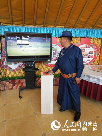孟克巴雅爾為記者演示“智慧放牧”系統(tǒng)。(富麗娟 攝)
