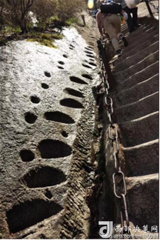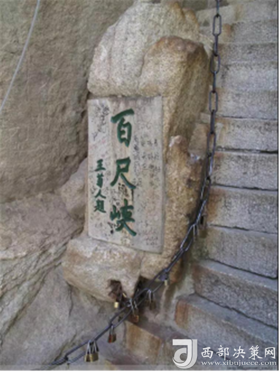 第二道險(xiǎn)關(guān)是百尺峽。這里兩壁高聳,中間夾著一塊從天而降的巨石,上刻“驚心石”三個(gè)大字,游人從石下小路穿過(guò),確實(shí)驚心動(dòng)魄。第三道險(xiǎn)關(guān)是老君犁溝,這是夾在陡峭石壁之間的一條溝狀險(xiǎn)道,有570多個(gè)石階。相傳這里原先根本沒(méi)有路,太上老君見(jiàn)了,就將手中的如意柄變成一張鐵犁, 又牽來(lái)青牛,一夜間犁成了這條山溝。傳說(shuō)青牛犁完溝后,見(jiàn)華山景色壯美,便化為石牛,永遠(yuǎn)地留在了華山之上。溝的盡頭是一道陡壁, 名為“猢猻愁”。顧名思義,連猴子都發(fā)愁,可見(jiàn)這里的山勢(shì)多么陡峭。