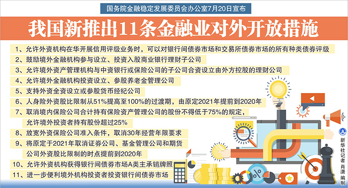 國(guó)務(wù)院金融穩(wěn)定發(fā)展委員會(huì)辦公室20日對(duì)外宣布,為貫徹落實(shí)黨中央、國(guó)務(wù)院關(guān)于進(jìn)一步擴(kuò)大對(duì)外開放的決策部署,按照“宜快不宜慢、宜早不宜遲”的原則,在深入研究評(píng)估的基礎(chǔ)上,推出以下11條金融業(yè)對(duì)外開放措施: