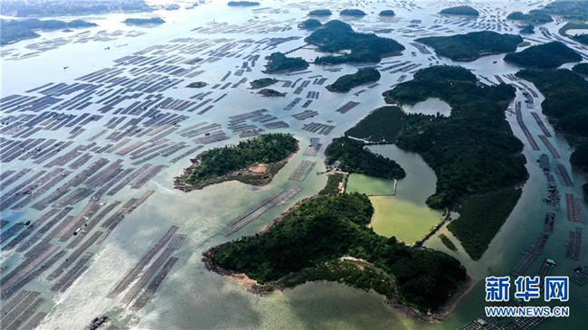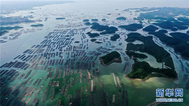 這是無人機(jī)拍攝的欽州市以七十二涇海域為中心的連片萬畝大蠔養(yǎng)殖基地(7月20日攝)。 新華社記者 張愛林 攝
