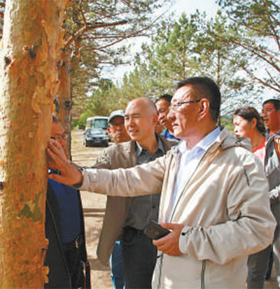 于海?。ㄇ埃┡c苗木專家在察看林場樹木。新華社發(fā)