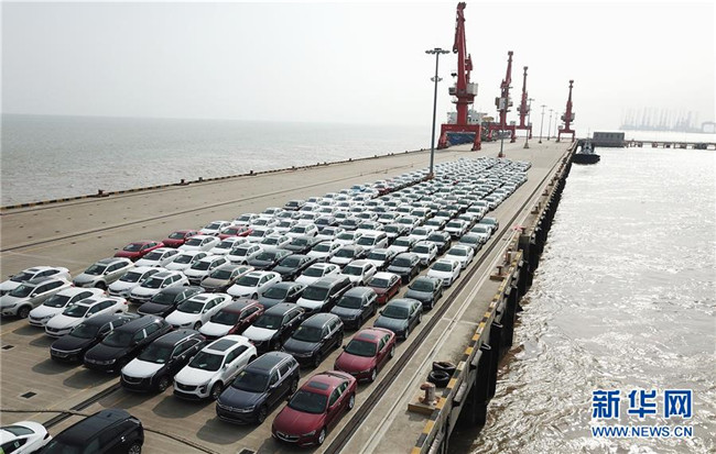 在位于上海臨港的上海南港碼頭,新出廠的汽車等待裝船轉(zhuǎn)運(6月27日無人機(jī)拍攝)。 新華社記者 方喆 攝