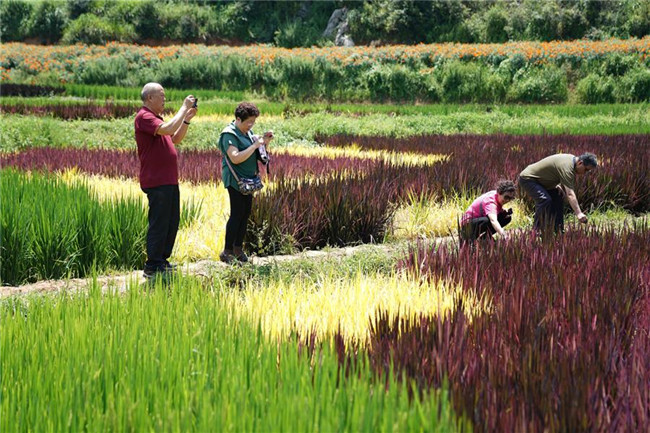 云南省昆明市宜良縣著力打造創(chuàng)意農(nóng)業(yè)、景觀農(nóng)業(yè)、實(shí)現(xiàn)“以農(nóng)帶旅、以旅興農(nóng)”的產(chǎn)業(yè)發(fā)展,其中種植的數(shù)百畝彩色稻田,在田間繪制了各類美麗畫卷,吸引眾多游客前來觀光。 新華社記者 秦晴 攝