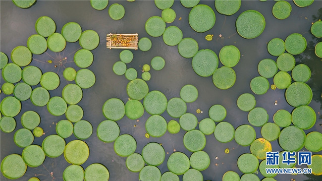 巨大的王蓮葉片如同一個(gè)個(gè)綠色的大玉盤(pán),錯(cuò)落有致地鋪滿整個(gè)水塘,十分壯觀。新華網(wǎng)發(fā)(趙熠 攝)