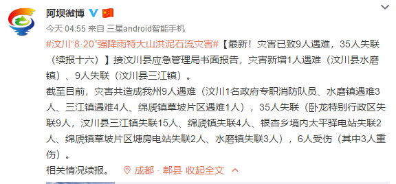 截至目前,災害共造成我州9人遇難(汶川1名政府專職消防隊員、水磨鎮(zhèn)遇難3人、三江鎮(zhèn)遇難4人、綿虒鎮(zhèn)草坡片區(qū)遇難1人),35人失聯(lián)(臥龍?zhí)貏e行政區(qū)失聯(lián)9人,汶川縣三江鎮(zhèn)失聯(lián)15人、綿虒鎮(zhèn)失聯(lián)4人、銀杏鄉(xiāng)境內太平驛電站失聯(lián)2人、綿虒鎮(zhèn)草坡片區(qū)塘房電站失聯(lián)2人、水磨鎮(zhèn)失聯(lián)3人),6人受傷(其中3人重傷)。