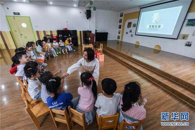 當(dāng)日,浙江省湖州市織里鎮(zhèn)晟舍幼兒園的小朋友們迎來了開學(xué)第一課——垃圾分類課。幼兒園通過請小朋友觀看幻燈片、動畫短片以及進行趣味游戲等方式,讓孩子們在開學(xué)之初了解垃圾分類知識和垃圾分類的重要性。據(jù)了解,織里鎮(zhèn)所有幼兒園和中小學(xué)目前都已經(jīng)將垃圾分類常識課放入到學(xué)校日常課程中。 新華社記者 徐昱 攝