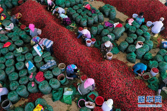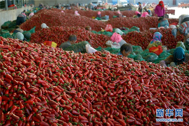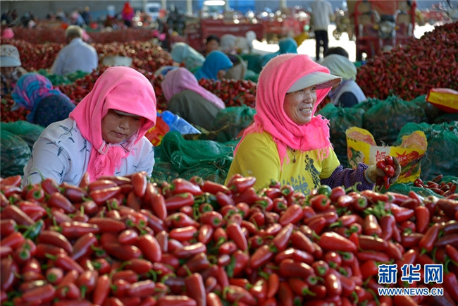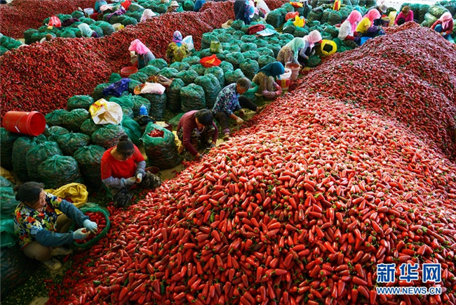 這是近日在甘肅省高臺(tái)縣拍攝的辣椒分揀、挑選場景。時(shí)下,高臺(tái)縣宣化鎮(zhèn)和駱駝城鎮(zhèn)種植的1700畝墨西哥辣椒進(jìn)入采摘和收購期,火紅的辣椒堆積如山,映紅了農(nóng)民的笑臉。新華網(wǎng)發(fā)(鄭耀德 攝)