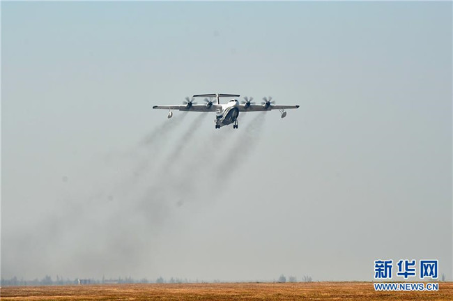 “鯤龍”AG600在珠海金灣機場起飛(2017年12月24日攝)。新華社記者 梁旭 攝