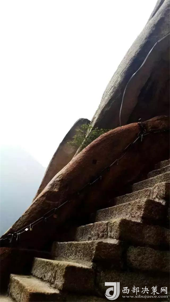 過千尺幢經(jīng)百尺峽就到了“老君犁溝”,其盡頭是“猢猻愁”,顧名思義,連猴子都發(fā)愁,足以說明崖壁有多么陡峭。過了“猢猻愁”就到了華山北峰。是夾在陡峭石壁之間一條深不可測的溝狀險道,石階570多階。傳說太上老君過此處,見無路可通,就牽來青牛一夜間犁成這條山溝。至今在西側的崖上仍有石溝赫然若犁槽。
