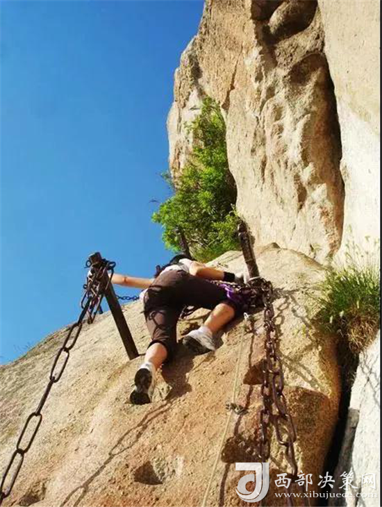 是從東峰到下棋亭必經(jīng)的一段絕壁險道,為華山著名的險道之一。其路鑿于上凸下凹的倒坎懸崖上,下視唯見寒索垂于凌空,不見路徑。游人至此,須面壁挽索,以腳尖探尋石窩,交替而下,其中幾步須如鷹鷂一般左右翻轉身體才可通過,故得此名。