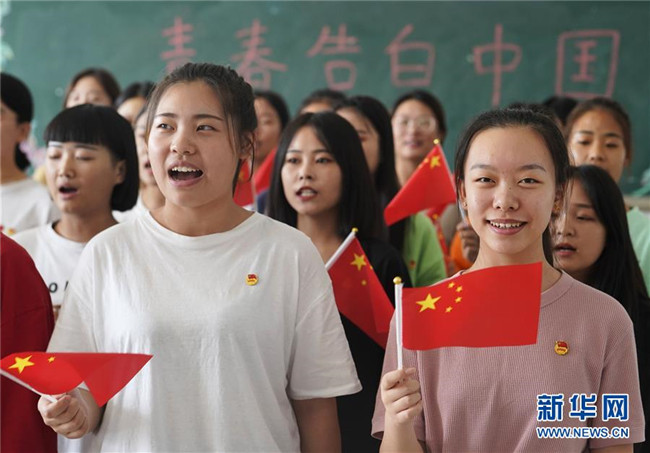 9月18日,邢臺(tái)技師學(xué)院的學(xué)生在演唱歌曲《我和我的祖國》。