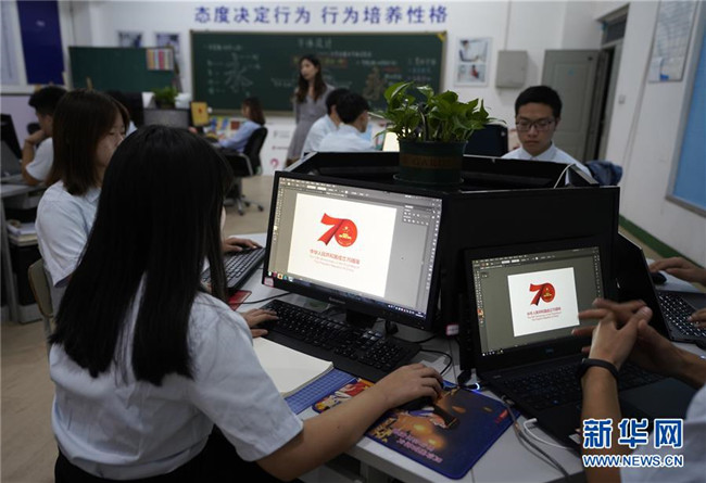 9月18日,邢臺(tái)技師學(xué)院的學(xué)生在平面設(shè)計(jì)課程上臨摹慶祝中華人民共和國成立70周年活動(dòng)標(biāo)識(shí)。