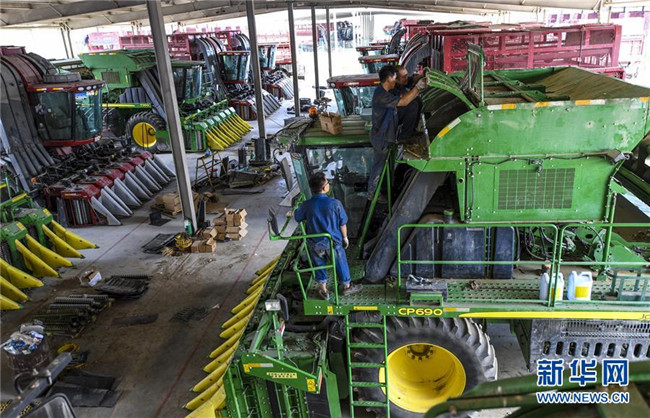在位于新疆生產建設兵團第六師五家渠市的新疆準噶爾銀豐農機裝備有限公司內,檢修人員在檢修保養(yǎng)采棉機(7月31日攝)。 新華社記者 王菲 攝