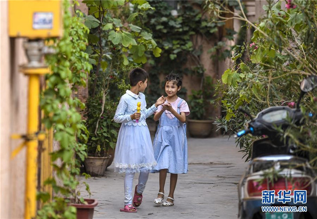 在新疆喀什古城景區(qū)內,當?shù)貎擅∨笥炎咴谙锏纼龋?月12日攝)。新華社記者 王菲 攝