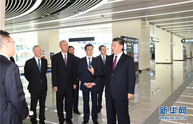 9月25日上午,北京大興國(guó)際機(jī)場(chǎng)投運(yùn)儀式在北京舉行。中共中央總書(shū)記、國(guó)家主席、中央軍委主席習(xí)近平出席儀式,宣布機(jī)場(chǎng)正式投運(yùn)并巡覽航站樓。這是習(xí)近平在軌道交通大興機(jī)場(chǎng)線(xiàn)草橋站進(jìn)站大廳,結(jié)合展板聽(tīng)取情況介紹。 新華社記者 謝環(huán)馳 攝