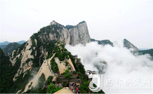 石作蓮花云作臺,峰巔有巨石形似蓮花瓣,古代文人多稱其為蓮花峰,居西而得名,西北絕崖千丈,似刀削鋸截,其陡峭巍峨、陽剛挺拔之勢,為華山之最險峰。