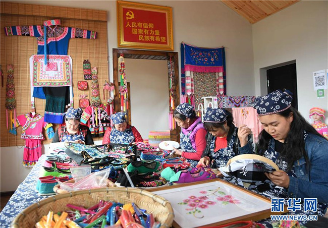 10月16日,團(tuán)結(jié)村的幾名“巧媳婦”在刺繡。新華社記者 楊宗友 攝