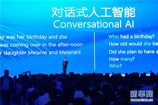 10月20日,微軟公司代表在介紹“統(tǒng)一自然語(yǔ)言預(yù)訓(xùn)練模型與機(jī)器閱讀理解”。 新華社記者 黃宗治 攝