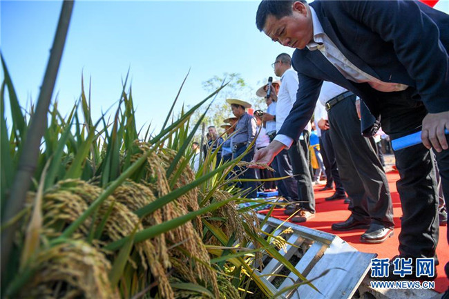 農(nóng)業(yè)專家在第三代雜交水稻新組合試驗(yàn)示范衡南基地測(cè)產(chǎn)現(xiàn)場(chǎng)查看水稻生長(zhǎng)情況(10月21日攝)。 新華社記者 陳澤國(guó) 攝