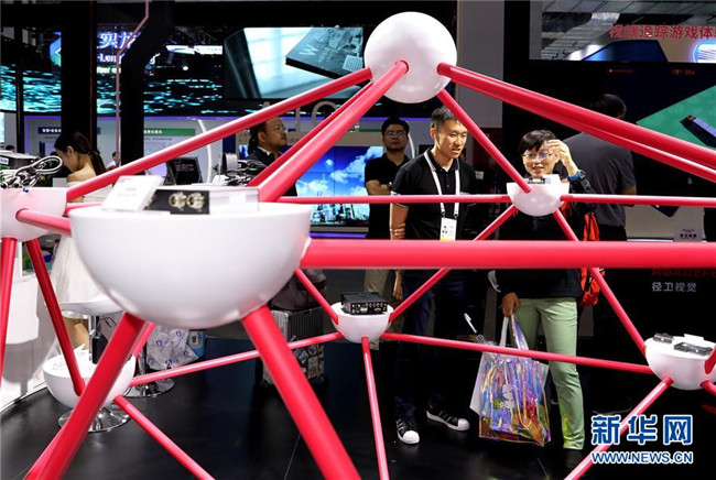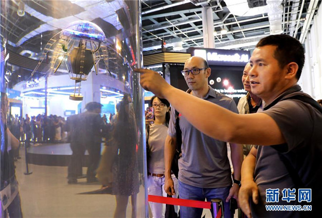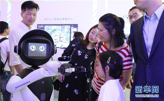 參觀者在上海舉行的2019世界人工智能大會(huì)上與一個(gè)智能機(jī)器人進(jìn)行交流(8月29日攝)。新華社記者 方喆攝