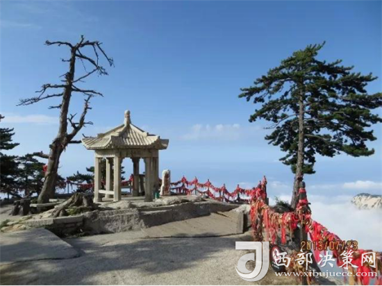 整個(gè)西峰為一塊渾然天成的巨石,北面臨空,懸崖絕壁如刀削鋸截,東西兩側(cè)狀如蓮花,因此也稱“蓮花峰”,這里更是“劈山救母”、“寶蓮燈”等傳說故事的發(fā)生地。