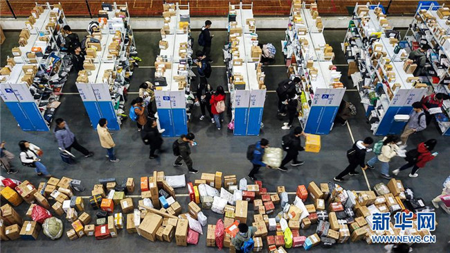 南京航空航天大學(xué)師生在校園臨時快遞取件點領(lǐng)取快遞(2018年11月13日攝)。為應(yīng)對“雙十一”大量校園快遞包裹,南京航空航天大學(xué)在原“快遞超市”的基礎(chǔ)上,將學(xué)校體育中心室內(nèi)網(wǎng)球場搭建為臨時快遞取件點,方便在校師生取件。新華社記者 李博 攝