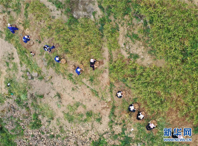 11月12日,廣西賀州市平桂區(qū)鵝塘鎮(zhèn)槽碓村的土瑤群眾在收獲大肉姜(無人機拍攝)。
