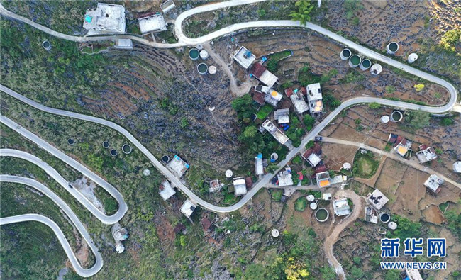 廣西大化瑤族自治縣百馬鄉(xiāng)百馬村群眾的家庭水柜分布在房前屋后(11月14日無人機(jī)拍攝)。 新華社記者 黃孝邦 攝