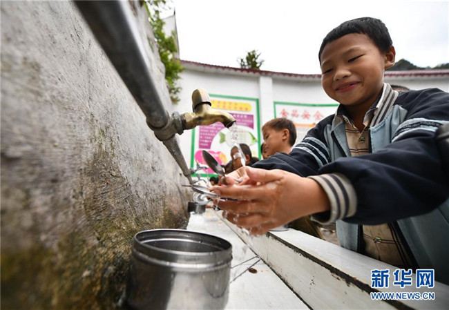 在廣西大化瑤族自治縣板升鄉(xiāng)八好小學(xué),同學(xué)們在用自來水洗餐具(11月13日攝)。 新華社記者 黃孝邦 攝