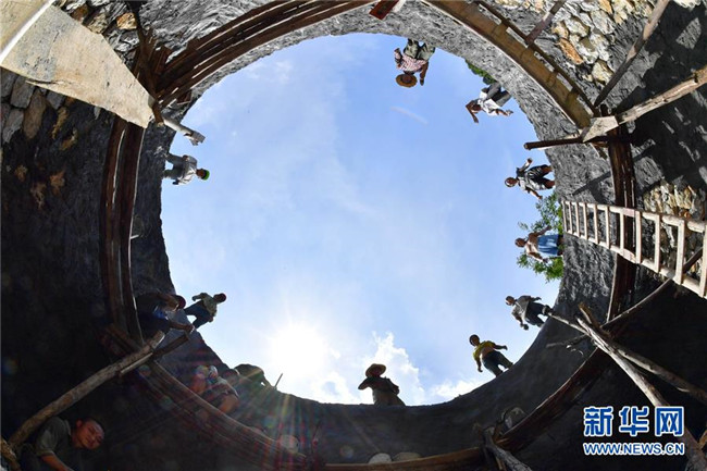 在廣西大化瑤族自治縣板升鄉(xiāng)弄勇村,群眾在修建家庭水柜(2017年9月2日攝)。新華社記者 黃孝邦 攝