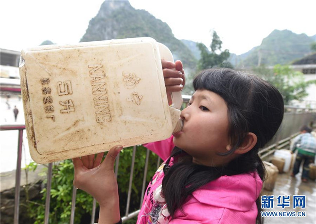 在廣西大化瑤族自治縣板升鄉(xiāng)八好小學(xué),一名學(xué)生喝水桶里的雨水(2014年11月24日攝)。八好小學(xué)有400多名學(xué)生,曾僅有一個不足100立方米的水柜,用于收集儲存樓頂?shù)挠晁?,學(xué)生需定期定量用水。遇到長時間不下雨,學(xué)校需要到鄉(xiāng)政府所在地運水。如今,學(xué)校修建了5個大水柜,并從兩公里外引泉水到校園,飲水難問題得到解決。 新華社記者 黃孝邦 攝