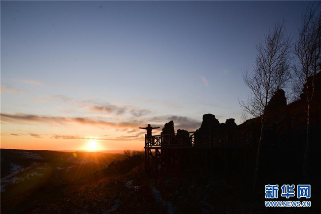 這是11月25日拍攝的克什克騰石陣景區(qū),一名游客張開(kāi)雙臂面向夕陽(yáng)。