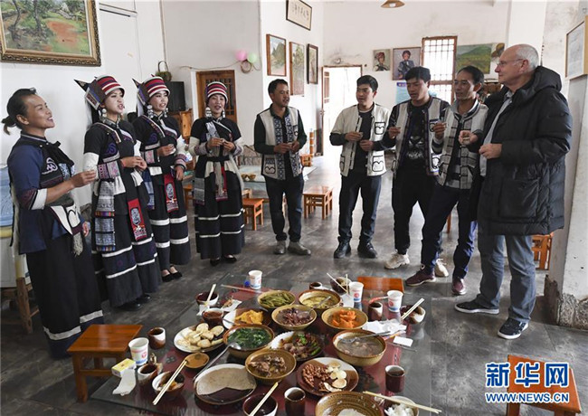 11月28日,大糯黑村村民畢興學(左五)、李學芝(左一)夫婦和工作人員們一起給外國游客(右一)祝酒。李學芝和丈夫畢興學經(jīng)營著一家農(nóng)家樂,生意紅火。新華社記者王全超攝