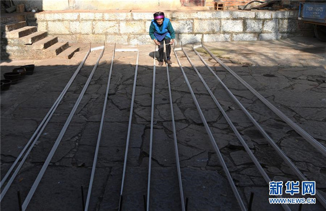 11月28日,75歲的大糯黑村村民畢秀珍在整理織麻布用的麻線。新華社記者周華攝