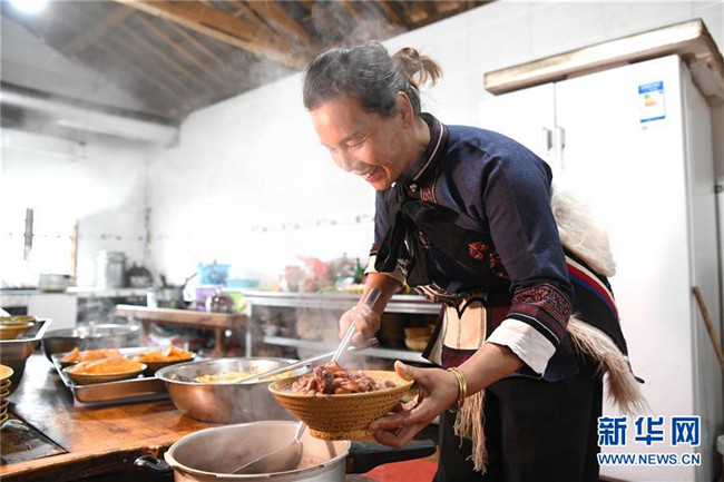 11月28日,42歲的大糯黑村村民李學芝在廚房內(nèi)為游客準備午餐。李學芝和丈夫畢興學經(jīng)營著一家農(nóng)家樂,生意紅火。新華社記者周華攝