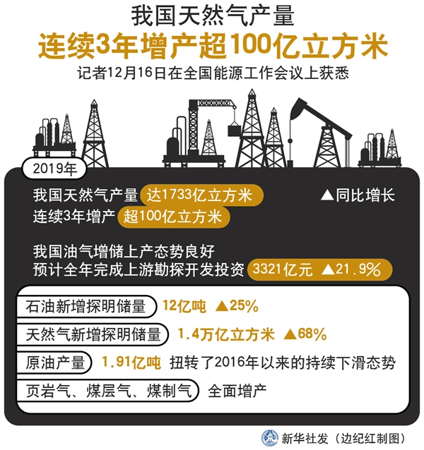 2019年,我國(guó)天然氣產(chǎn)量達(dá)1733億立方米,連續(xù)3年增產(chǎn)超100億立方米。