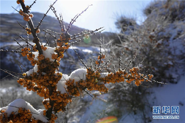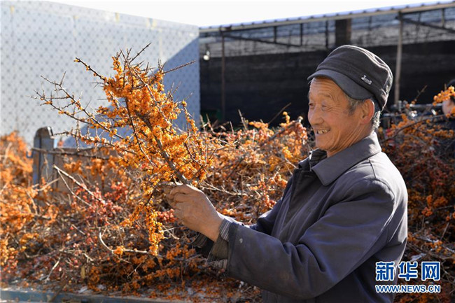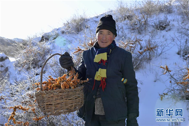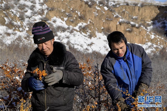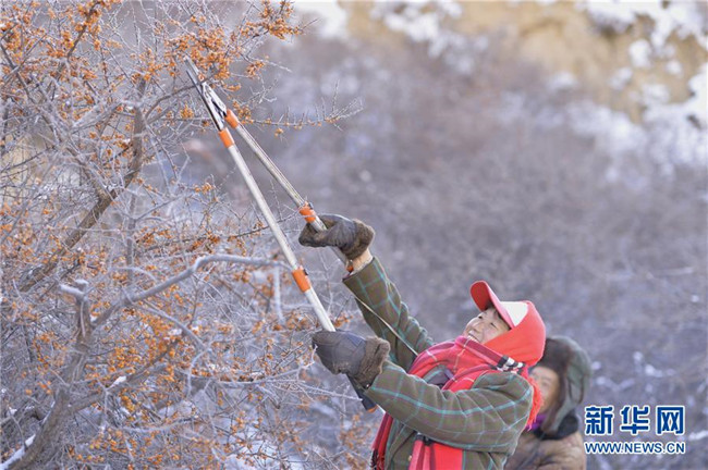 12月18日,當(dāng)?shù)厝罕娫谇逅涌h野生沙棘保護(hù)地采摘沙棘果。 新華社記者 徐欽 攝