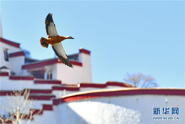 一只赤麻鴨從布達(dá)拉宮旁飛過(12月20日攝)。新華社記者 張汝鋒 攝