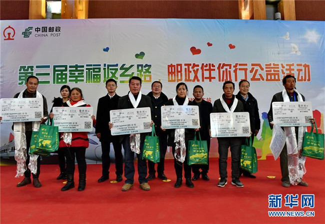 當日,由中國郵政集團公司西藏自治區(qū)分公司和青藏鐵路公司拉薩站共同組織的第三屆“幸福返鄉(xiāng)路·郵政伴你行”免費贈送火車票公益活動在拉薩火車站舉行。中國郵政集團公司西藏自治區(qū)分公司出資20余萬元購買12月23日至12月26日拉薩至成都、重慶、西寧、蘭州方向共計436張火車票,免費贈送給西藏外來務(wù)工人員。青藏鐵路公司拉薩站為受助務(wù)工人員設(shè)置專用安檢通道和候車專區(qū)。