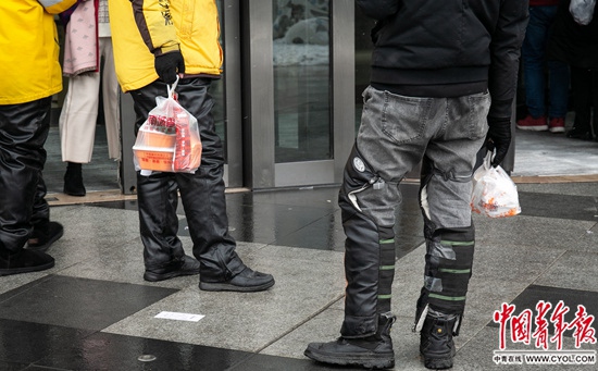 12月16日,北京通州區(qū)萬達寫字樓門口,兩位外賣員在等待顧客取餐。見習記者 張玉佳/攝