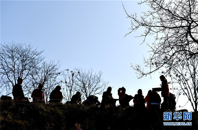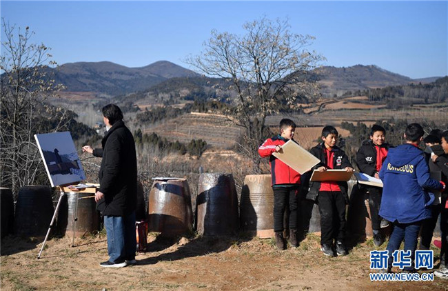 一名藝術(shù)家(左一)和洛寧縣羅嶺鄉(xiāng)初級(jí)中學(xué)的學(xué)生們?cè)诼鍖幙h前河村進(jìn)行繪畫創(chuàng)作(12月29日攝)。新華社記者 李嘉南 攝