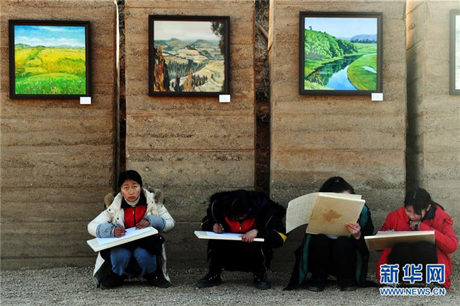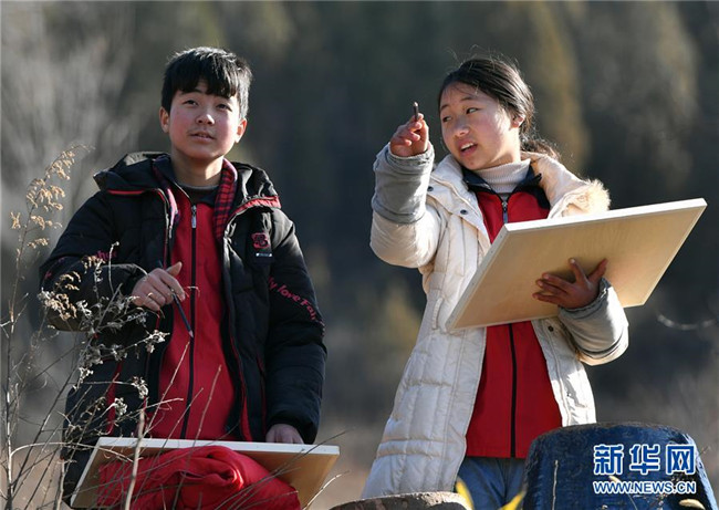 洛寧縣羅嶺鄉(xiāng)初級(jí)中學(xué)學(xué)生在洛寧縣前河村進(jìn)行繪畫創(chuàng)作(12月29日攝)。新華社記者 李嘉南 攝