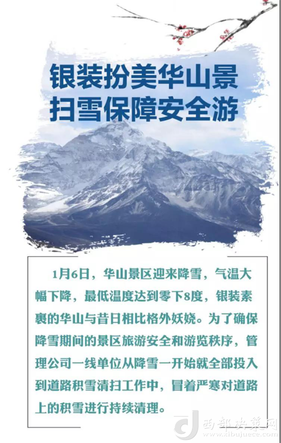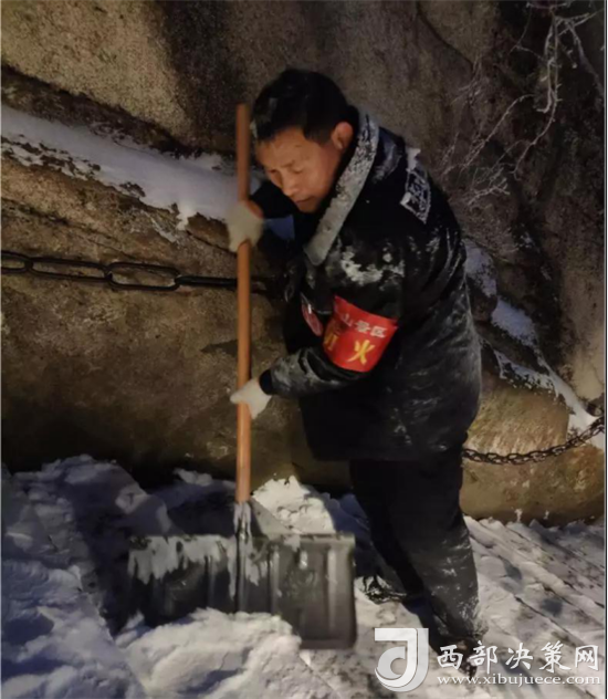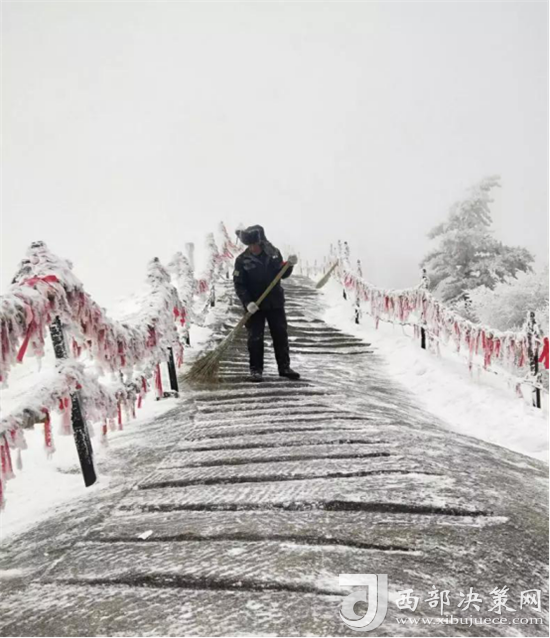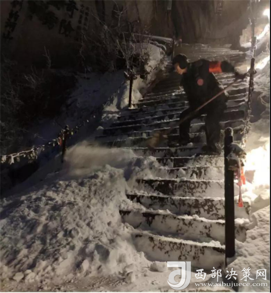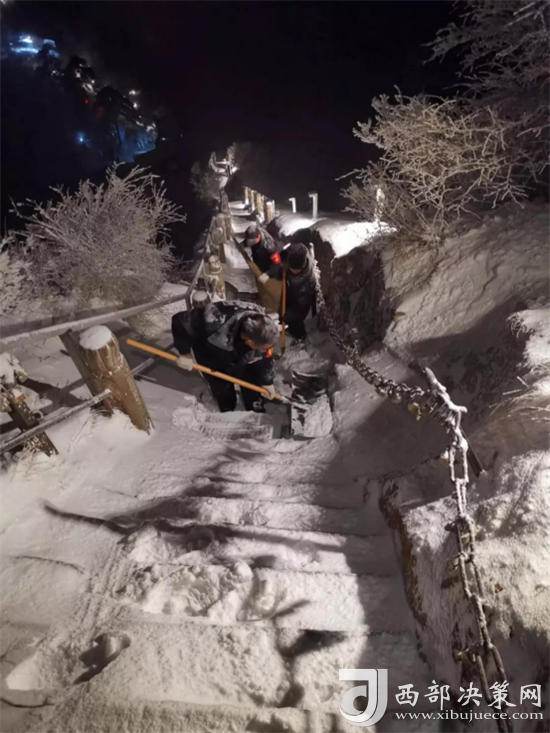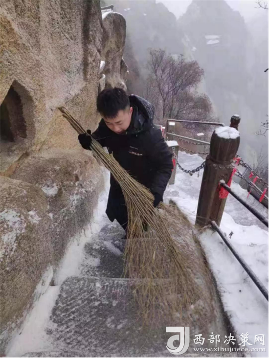 清晨天亮后,工作人員以常態(tài)化的工作要求持續(xù)對道路積雪進行細化清掃,防止路面結冰,發(fā)生安全事故。(供稿:華山景區(qū)管理公司)