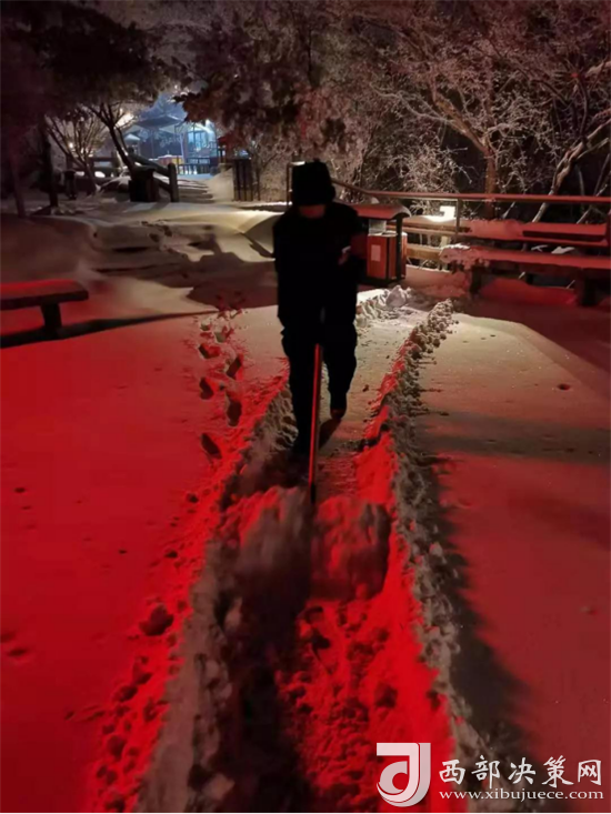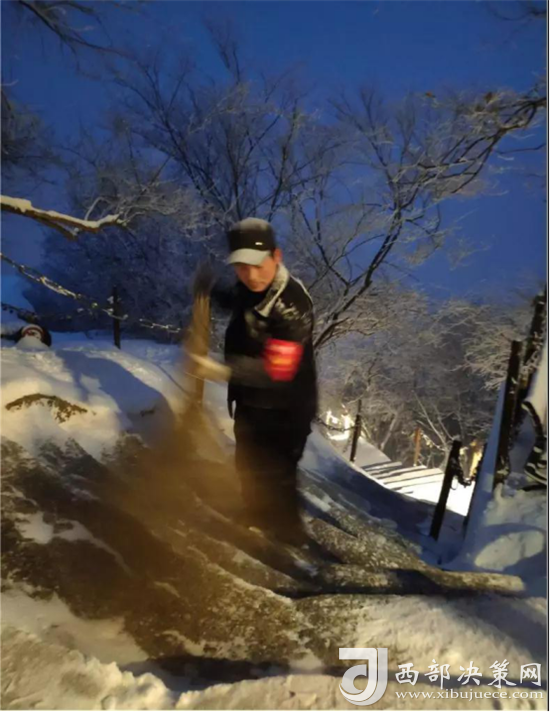 清晨天未亮時,主峰區(qū)全體人員冒著嚴寒降雪已經投入到清掃積雪的工作中。