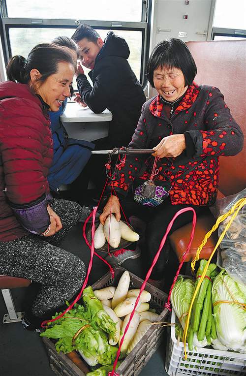 7269次列車(chē)車(chē)廂里,湖南省靖州苗族侗族自治縣太陽(yáng)坪鄉(xiāng)八龍村一組的71歲苗族婦女楊炳英(右)正在為旅客稱(chēng)菜。楊炳英是該村建檔立卡貧困戶(hù),已經(jīng)乘坐“慢火車(chē)”賣(mài)菜10多年,每月能有2000多元的收入。她開(kāi)心地說(shuō):“扶貧列車(chē)真好,既能掙錢(qián),又可觀(guān)光。”