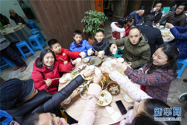 1月18日,游客在中山古鎮(zhèn)老街上體驗“千米長宴”傳統(tǒng)美食。當日中午,伴隨著一聲“開席嘍”,一年一度的“千米長宴”在重慶市江津區(qū)中山古鎮(zhèn)舉行。噴香的煙熏豆腐、軟糯的夾燒肉、可口的石板糍粑……800余桌年味十足的特色美食,吸引了兩萬多名游客前來體驗傳統(tǒng)民俗,感受“一雙筷子吃遍一條街”的暢快淋漓。中山古鎮(zhèn)自古就有“千米匯長宴萬人祈福祉”的習俗。每年春節(jié)期間,古鎮(zhèn)老街居民都會在千米長街上大擺“百家宴”,祝福生意興隆、家業(yè)興旺、風調雨順、五谷豐登。新華社記者劉潺攝